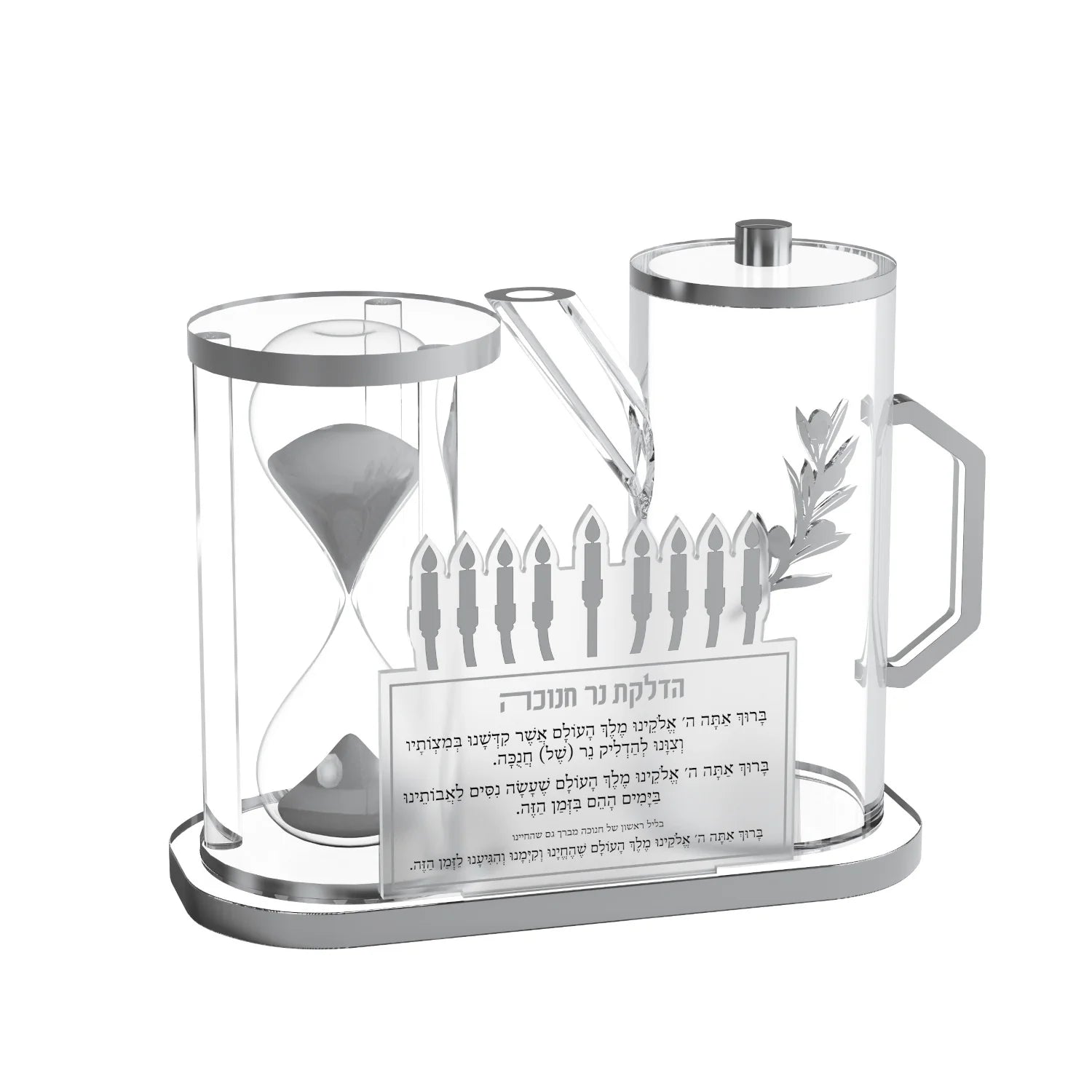 Illuminate your chanukah celebrations with this luxurious Hourglass & Oil Jug Set. With a stunning hourglass timer and an elegant oil jug, this set comes complete with brochos for your Menorah lighting. Available in both gold and silver editions, indulge in the sophisticated and exclusive style of this premium set.