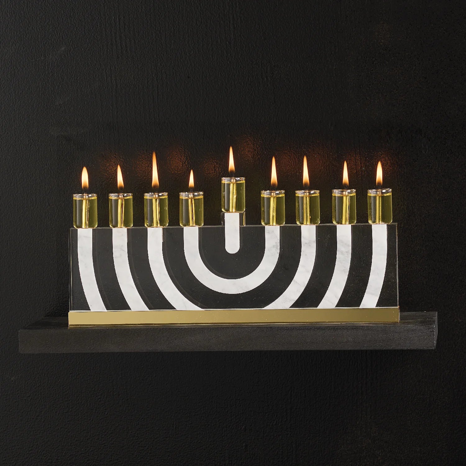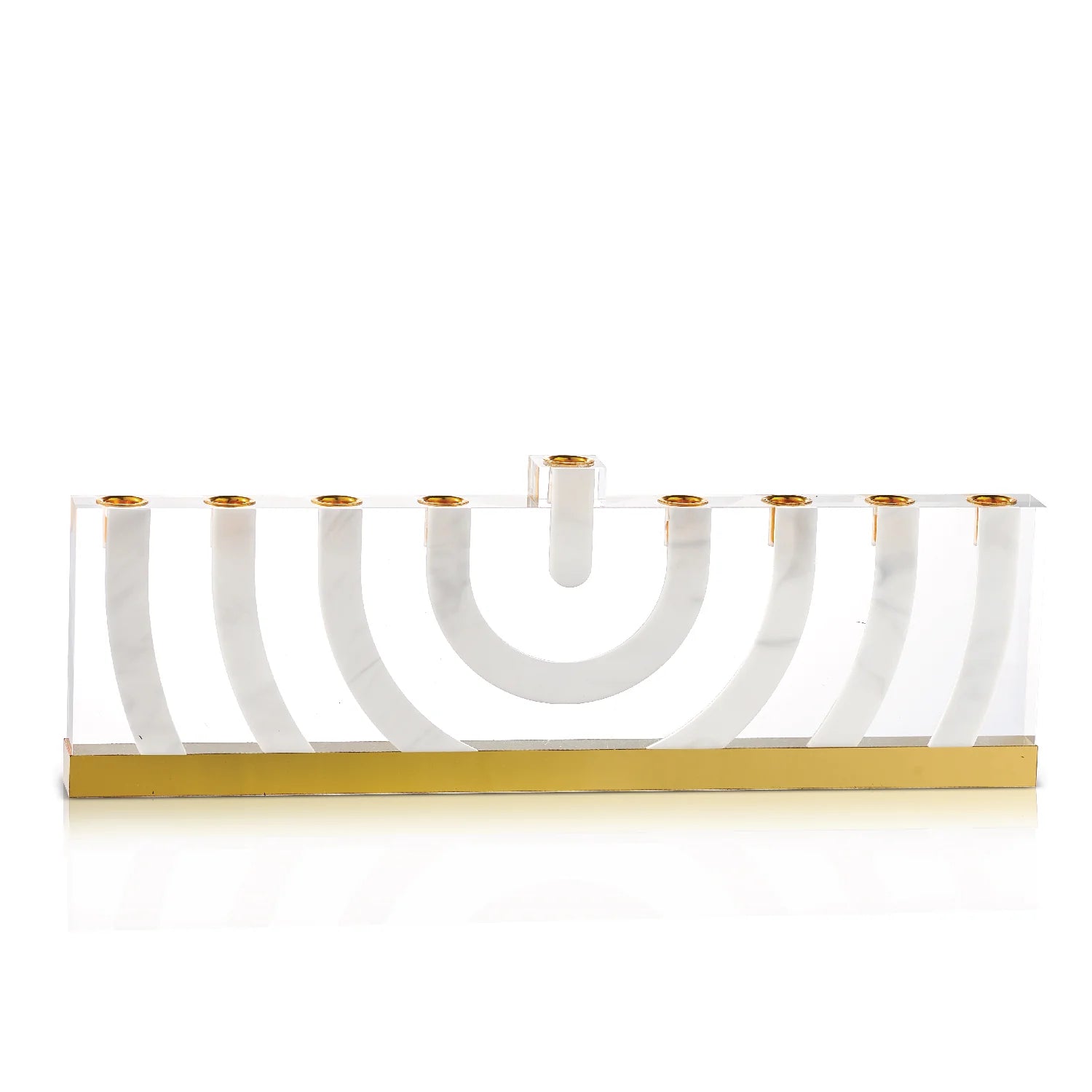 Illuminate your Chanukah with the Modern Arc Menorah. This stunning menorah is made from thick, durable clear lucite with white marble arcs that reimagine the traditional menorah. A gold mirror base completes the look, enhancing its radiant glow.