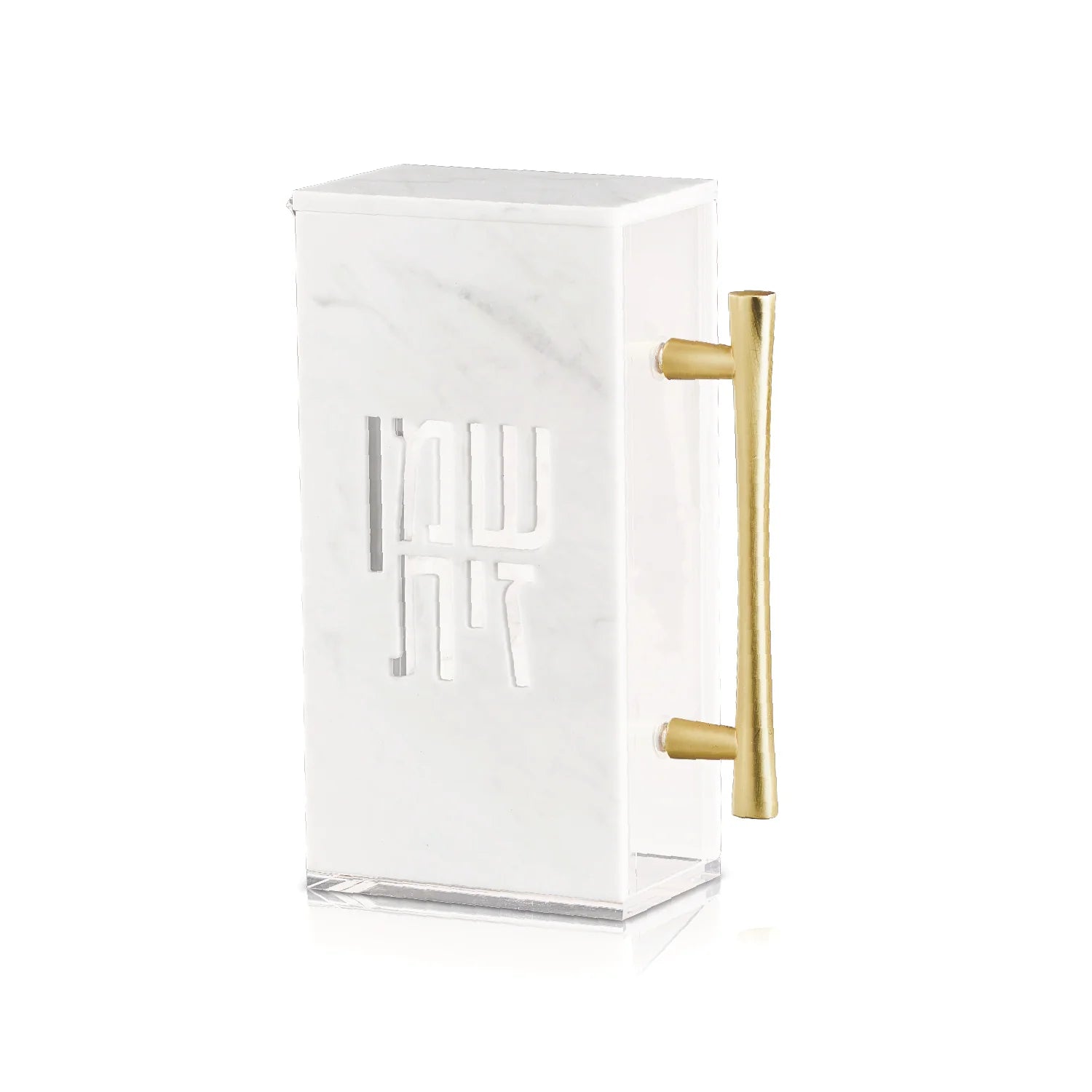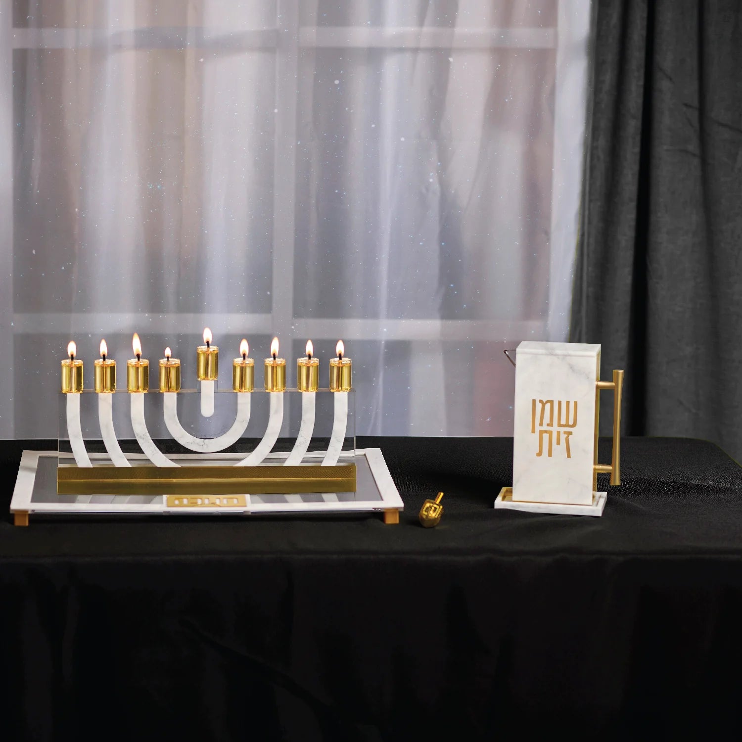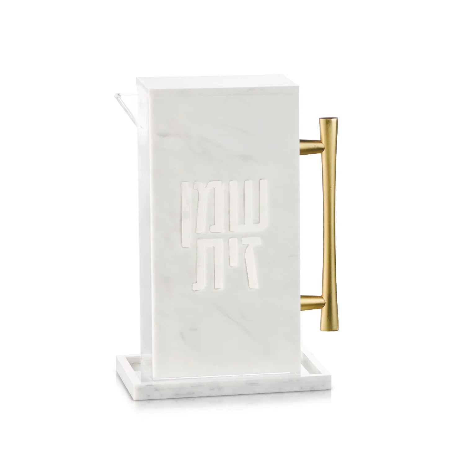 This elegant lucite oil pitcher combines functionality with sophistication. The modern laser-cut lettering beautifully showcases the oil within, while the gold metal handle adds a touch of elegance. The narrow spout ensures easy pouring, and the strong magnetic cover keeps it secure. The included tray will keep your Chanukah setup neat and beautiful. with gold metal handle